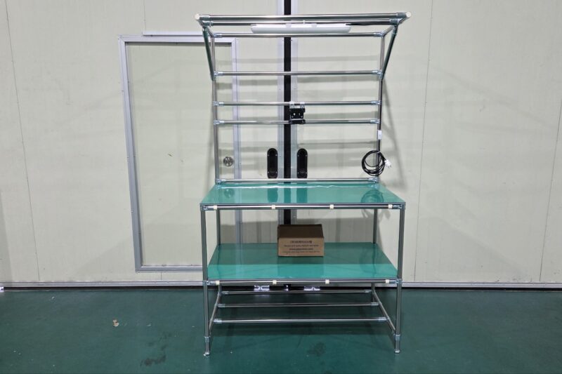 안녕하세요. 작업대 제작 전문업체 ㈜피제이시스템입니다. 제품 사이즈는 가로 1200mm * 세로 700mm * 높이 2000mm입니다. 사내에서 배치해놓고 사용한다고 하셔서 제작해드렸으며, 고객분께서 원하시는 치수로 제작해드렸습니다. 작업대 사양을 결정할 때 가장 중요한 점이 하나 있습니다. 작업자가 일어나서 작업을 하는지, 앉아서 작업하는지 파악 후 설계에 들어가야합니다. 일어나서 작업하는 입식 같은 경우 메인 상판의 높이는 바닥에서 약 850mm정도로 맞춰드리고 있으며, 앉아서 작업하는 좌식은 약 750mm정도로 설정하는것이 가장 이상적입니다. 메인 선반과 하부에는 보조선반으로 이루어져있으며, 앉아서 작업하기 때문에 발이 구조에 걸리지 않도록 최하단 구조는 파이프를 뒤쪽으로 잡아드렸습니다. 상판의 종류는 PVC 8T 회색 위에 제전매트를 부착해드렸습니다. PVC는 원형 파이프에 수평홀더 (PJ-38S)를 끼운 후 피스로 결착시킵니다. 또, 제전매트는 PVC판 위에 강력 양면테이프를 붙인 뒤 부착해드리고 있습니다. 작업대 상부에 보이시는 브라켓은 모니터를 달 수 있도록 구조를 잡아드렸는데요. 모니터 사양 및 베사 규격을 알려주시면 그에 맞추어 가능 브라켓 적용이 가능합니다. 최상부에는 LED등도 추가해드렸습니다, LED등은 600폭 SIZE에 조도는 30W정도 됩니다. LED등의 위치는 작업자가 메인 상판에서 작업하면서 눈이 부시지 않는 위치로 잡아드리는것이