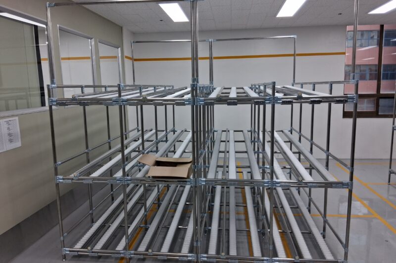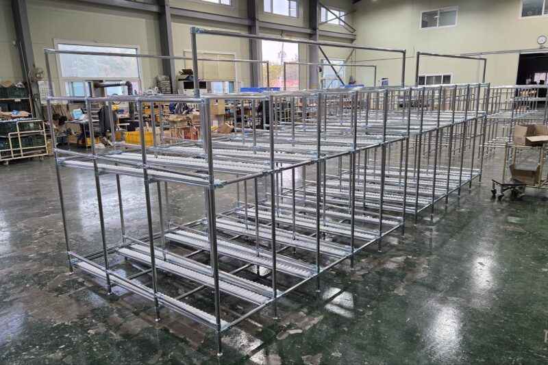 안녕하세요. 랙을 맞춤으로 제작해드리고 있는 업체 “(주)피제이시스템”입니다. 오늘은!! 롤러(플라콘)를 이용하여 자재를 보관할수있는 랙을 소개해드릴건데요~! 공장 내부의 자재보관라인에 배치해놓고 사용하기 아주 적합합니다. 업로드 했었던 선입선출랙과는 달리 조금 다른 사양이 보이실텐데요! 바로!
