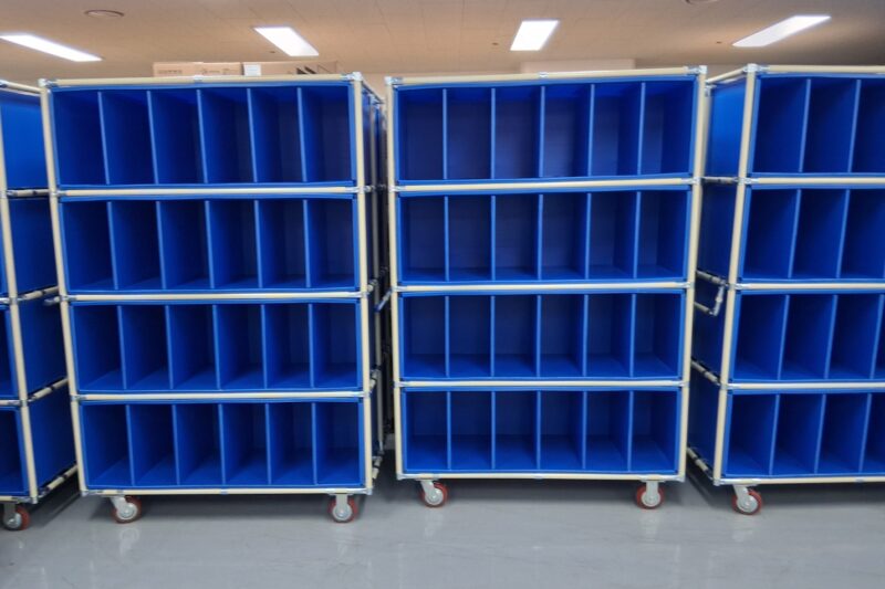 안녕하세요. 대차를 전문적으로 제작하고 납품해드리고 있는 기업 “(주)피제이시스템”입니다. 경상북도 경산시에 위치한 대기업인 쿠* 물류센터에 납품해드렸습니다. 물류센터에서 없어서는 안되는 대차!! 저희가 직접 미팅 후 설계하고 납품까지 모두 해드리고 있습니다! 총 4단으로 구성해드렸으며, 단 마다 적재하는 제품의 하중은 약 10kg 정도입니다. 랙의 적재하중은 매우 중요합니다! 고객분께서 올리시는 제품의 크기 및 무게가 다 달라서 그에 맞춰서 하중을 맞춰드리고 있습니다. 저희 파이프랙의 장점은 선입선출랙이나 대차 등 다양한 품목으로 제작을 하고, 맞춤으로 제작이 가능하기에 큰 장점을 지니고 있습니다. 파이프(PIPE)의 종류는 코팅 (회색) 1.1T와 메탈조인트 (아연도금)로 구성해드렸습니다. 파이프는 원형으로 되어있으며, 종류는 크게 2가지로 분류 할 수 있습니다. 스테인리스와 철이 섞인 SUS Pipe와 ABS재질인 코팅파이프인데요. SUS PIPE 같은 경우 0.7T, 0.9T, 1.1T로 Coated PIPE는 1.1T로 분류됩니다. 단가적으로 봤을 때 SUS 0.7T와 Coated Pipe 1.1T가 비슷하다고 보실 수 있습니다. 서로의 장단점까지 말씀드리면 길어지니 다음 포스팅에서 소개해드리도록 하겠습니다! 대차는 2가지 종류로 제작해드렸으며, 각 사용하는 용도는 다르고 용도에 맞도록 설계 및 제작해드린거라 보시면 됩니다! 첫번째로 노트북 선반 및 제품 적재대차인데요.