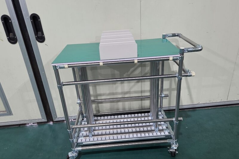 안녕하세요. 대차 및 랙을 다루고 있는 피제이시스템입니다! 저희는 조립식 및 용접식 모두 생산, 제작해드리고 있습니다. 고객분이 원하시는 방향성 또는 제품 하중에 따라서 조립, 용접식으로 선정해드리고 있습니다. 각각 장단점이 있어서 어떤 방식이 더 좋다는것은 없어서 사용하고자 하는 제품의 크기, 무게에 따라서 맞는 방식을 추천드리고 있습니다. 위 제품의 Size는 가로 900, 세로 510, 높이 1000mm입니다. 복잡하지 않은 구조이여서 제작은 쉽고 빠르게 할 수 있었습니다. SUS(스테인레스) Pipe와 아연도금 처리가 되어있는 메탈조인트 등 기타 부속품들로 이루어져있으며, 볼트와 너트를 이용하여 Metal Joint를 조여주어 형상을 만든 것이라고 보실 수 있습니다. 대차에서 빠질 수 없는 바퀴도 부착해드렸는데요. Caster(바퀴)의 사양은 3인치 볼트타입 제전용입니다. 제전용은 보통 색상이 검정색으로 되어있고 볼트타입은 원형으로 되어있는 파이프 속에 부싱을 삽입하여 부싱의 나사산이 나져있는 부분에 돌려서 결합해주는 방식으로 제작해드렸습니다. 또, 볼트타입은 대차의 사이즈가 작을 경우 대차 바깥쪽으로 위치해있어서 안전성이 보장되지만 땅이 고르지 못한 곳에서 사용하게 되면 부싱에 결합해준 부분이 조금씩 풀리는 경우가 있습니다. 이를 방지하고자 스프링와셔를 사용하고 있습니다. 메인 상판에는 POMAX 10T (흰색)과 제전매트를