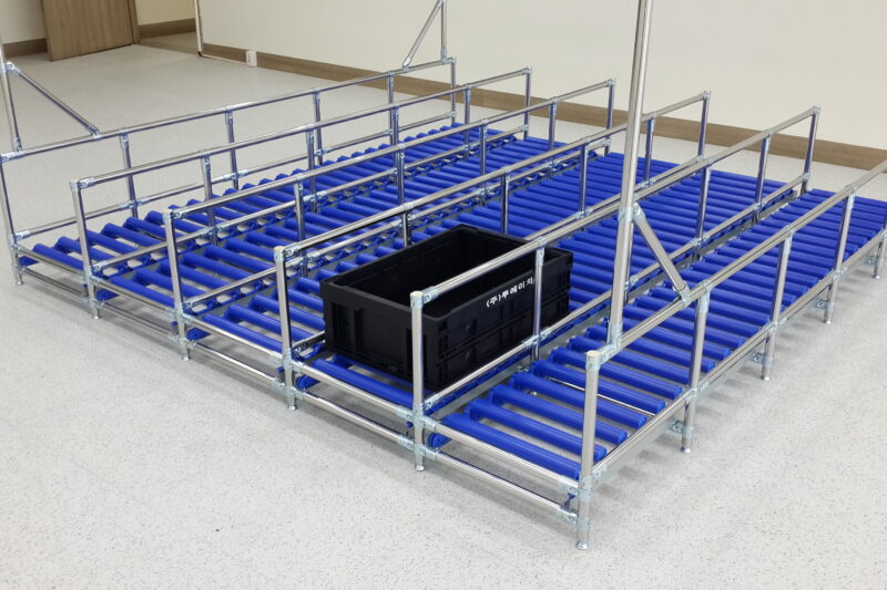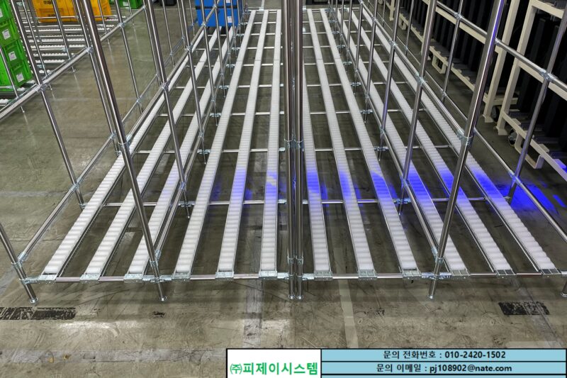 안녕하세요. 랙을 맞춤으로 제작해드리고 있는 업체 “(주)피제이시스템”입니다. 오늘은!! 롤러(플라콘)를 이용하여 자재를 보관할수있는 랙을 소개해드릴건데요~! 공장 내부의 자재보관라인에 배치해놓고 사용하기 아주 적합합니다. 업로드 했었던 선입선출랙과는 달리 조금 다른 사양이 보이실텐데요! 바로!