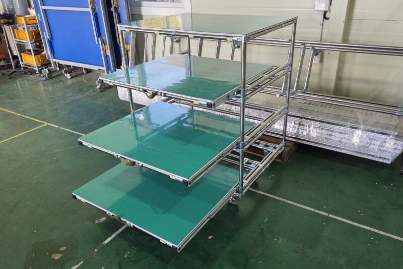 안녕하세요~ 조립식 대차 및 랙 제작 전문업체 “(주)피제이시스템”입니다~! 금일 만나보실 제품은~~ 슬라이드레일 부품을 이용한 적재대차(이동/운반대차)입니다. Size를 맞춤으로 제작하였고 사양도 고객분과 contact하여 정하였습니다. 제품의 전체 외곽 크기는 가로 1000mm, 세로 800mm, 높이 1200mm입니다. 총 3단으로 구성해드렸으며, 일반 서랍형 같이 사용하실 수 있도록 슬라이드레일을 단마다 부착하여 서랍형으로 이용하실 수 있도록 제작해드렸습니다. 그냥 적재대처럼 사용하면 되지 왜 Slide Rail을 사용했을까 의문을 갖고 계시는 고객분들도 계실겁니다. 세로 폭이 800mm여서 제품을 넣고 뺄 때 손을 안쪽으로 깊숙히 넣어 사용해야하는 불편함이 있습니다. 이를 개선하기 위해서 레일을 부착하여 선반이 앞쪽으로 튀어나와서 제품을 적재 할 수 있도록 작업 효율성을 개선해드렸습니다. 서랍같이 선반을 꺼내려고 하는 손잡이도 필요한데요. 손잡이는 잡기 편리한 밴드로 고정해드렸습니다. 고정은 직결피스로 고정하며, 파이프 & 조인트를 제외하고 부자재 부착은 모두 직결피스로 이루어져 있습니다. 또, 의류기기를 적재하다보니 정전기 방지 기능이 들어가는 판 종류를 사용해야하는데 Pomax 10T + 제전매트 2T를 사용하여 조건을 맞춰드렸습니다. 포맥스는 화이트 색상이고 제전매트는 녹색입니다. 일반적으로 사용하시는 판의 종류라고 보시면 될거같습니다. 랙을 이동시키는데 사용되는 Caster도 부착해드렸는데요~