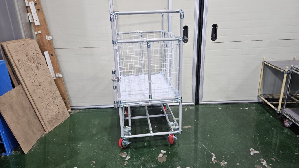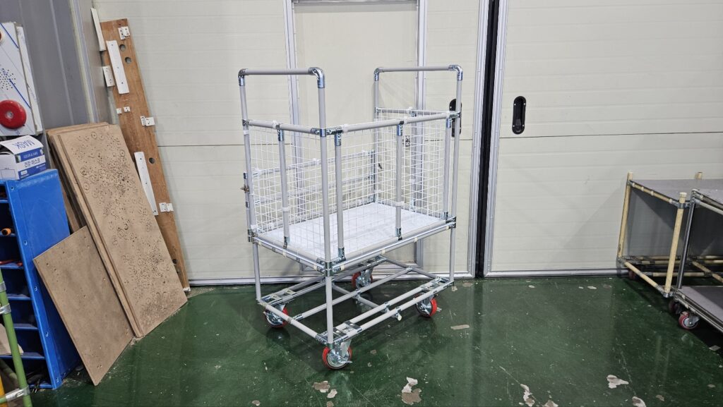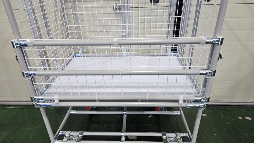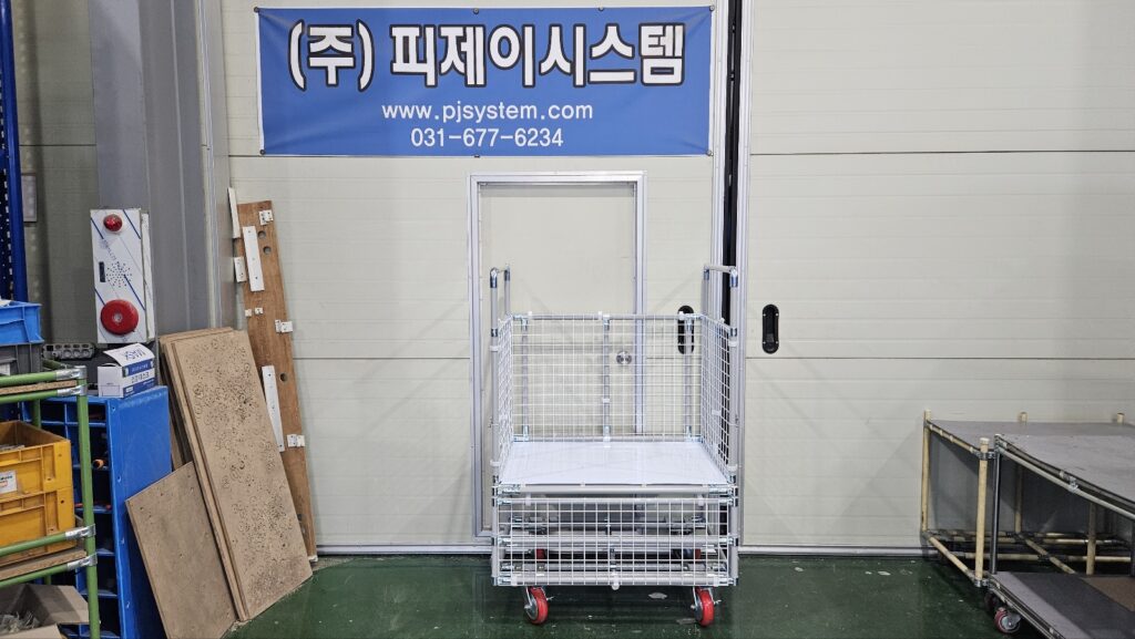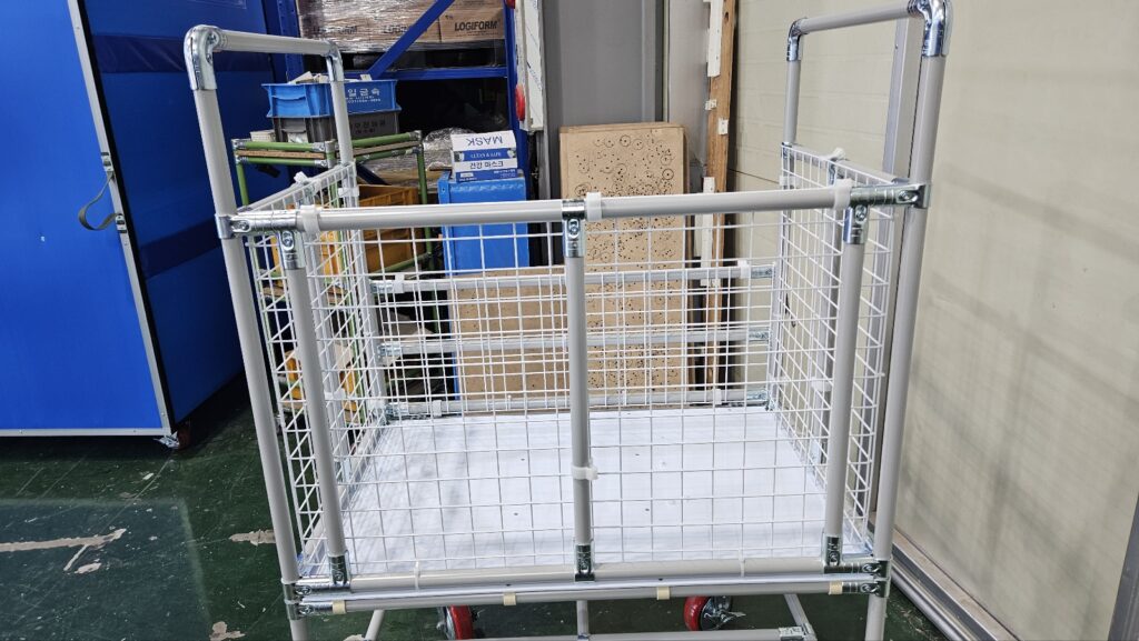 대차에 제품을 적재하였을 시 추락하지 않도록 사방에 메쉬망으로 부착해드렸으며, 메쉬망은 플라스틱 홀더로 고정해드렸습니다.
