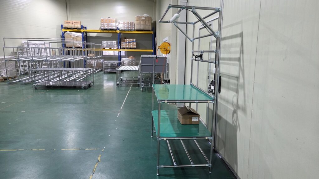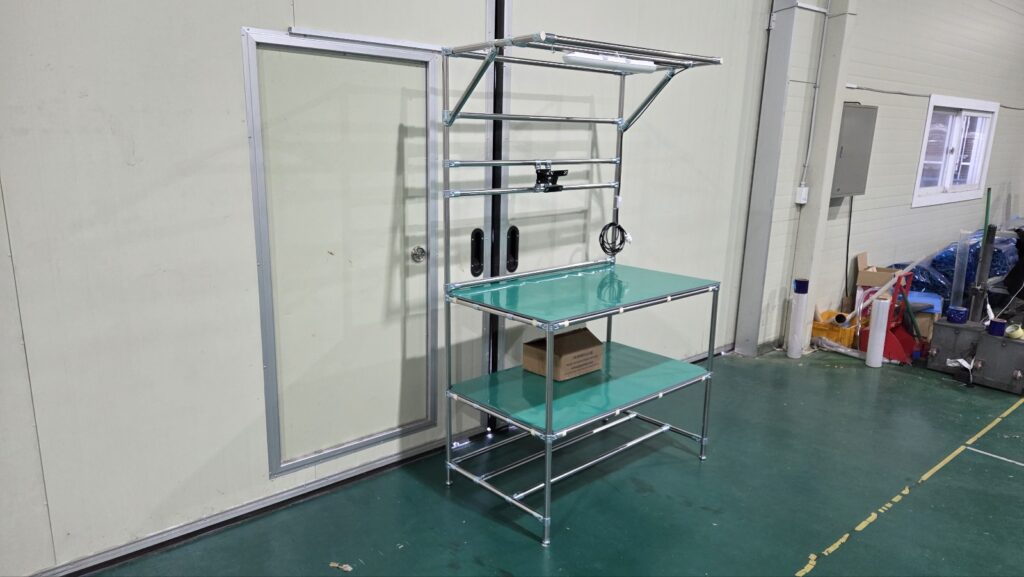 앉아서 작업하기 때문에 발이 구조에 걸리지 않도록 최하단 구조는 파이프를 뒤쪽으로 잡아드렸습니다.