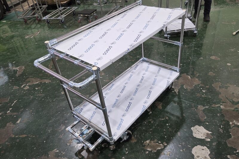 안녕하세요. 원형 파이프를 이용하여 조립식 대차를 전문으로 제작하고 있는 업체 (주)피제이시스템입니다. 어느덧 26년도! 새해가 밝았습니다~! 작년은 어떻게 시간이 흘렀는지 감이 안오네요. 그만큼 바쁘게 살았다는 증거가 아닐까 싶습니다. 오늘 소개 해 드릴 대차는 STS판을 이용하여 제작한 사례입니다. 원형 파이프 & Metal Joint를 이용하여 조립식으로써 맞춤제작이 가능합니다. 대차의 크기는 W: 1100, D: 500, 높이950mm입니다. 총 2단으로 구성해드렸으며, 파이프 틀에 STS(서스)판을 얹어서 피스로 견고하게 고정해드렸습니다. STS판의 재질은 매우 깔끔해보일 수 있는 헤어라인 재질로 맞춰드렸습니다~! PIPE의 종류는 크게 2가지가 있는데요~ STS재질인 파이프, ABS 코팅을 입힌 재질입니다. STS재질 같은경우 All 서스재질이 들어간것이 아닌 철 성분도 조금 섞여서 단가가 매우 저렴하고 강도도 훌륭합니다! 두께는 3가지로 분류 할 수 있는데요. 0.7T, 0.9T, 1.1T로 구성되어있습니다. 코팅 파이프의 색상은 크게 2가지로 Gray, Ivory색상이 있습니다. Black, Red, Blue 등 다양하게 있지만 특성 상 많이 선호하지 않기에 주문 시 생산을 해야합니다. 두께는 0.7T, 1.1T 등이 있습니다! 다음으로 메탈조인트는 철 재질에 아연도금이 되어있다고 보시면 될거같습니다. 니켈도금으로도 가능하니 참고해주시면 감사하겠습니다^^ 위 대차는 클린룸에