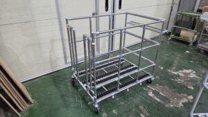 안녕하세요! 대차 및 랙을 제작하고 있는 업체 피제이시스템입니다. 요즘 봄이 다가오면서 날씨가 조금 푹 해진 감이 있는데요~~ 아직은 일교차가 크니 감기와 독감에 유의하시길 바라겠습니다! 금일 소개 해 드릴 제품은 메거진대차(사내용대차)입니다. 메거진에 PCB를 적재하고 그 매거진을 대차에 적재하여 운반하는 시스템입니다. 메거진의 SIZE는 가로 : 320 / 세로 : 355 / 높이 : 570(H)입니다. 투입방향인 문 방향 기준으로 양쪽으로 들어가기에 총 옆으로 2칸으로 적재가 됩니다. 세로 355mm인 방향으로 총 3개 적재가 필요하다고 하셔서 사이즈 맞춤으로 제작해드렸습니다. 그렇게 되면 대차 1대 당 적재 할 수 있는 메거진의 수량은 12EA입니다. 대차의 외곽 크기는 가로 : 830 / 세로 : 1170 / 높이 1120mm이며, 손잡이의 높이까지는 950mm로 맞춰드렸습니다. 바닥 ~ 대차 손잡이의 높이는 작업자마다 선호하시는 치수가 달라서 고객분과 미팅 및 상의 후 맞춰드리고 있는데요. 제작 후 도면으로 치수로 정했지만 실질적으로 사용을 해보셨을 때 높이 조정이 필요하다 싶으시면 조인트에 볼트와 너트가 체결되어있는 부분을 풀어서 높이 조절이 가능합니다. 조인트는 원형 Pipe와 구조가 이루어져 있어서 조립식의 모든 구조는