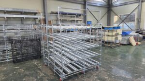 안녕하세요. 랙 및 대차 제작을 전문으로 하고 있는 (주)피제이시스템입니다. 오늘 저녁부터 진눈깨비와 비가 내린다고 합니다! 퇴근하실 때 안전하게 귀가하시길 바라며, 항상 안전이 우선입니다!! 오늘 ~ 포스팅으로 소개드릴 제품은 선입선출랙입니다. 고객분들께서 부르시는 명칭들이 각각 다 달라서 처음 접해보시는 분들은 생소한 단어일지 모릅니다. 대표적으로는 선입선출랙, 플라콘랙, 롤러랙, 슬라이드랙, 슬라이딩랙 등 다양한 명칭들로 문의하시곤 합니다. 1단부터 2단, 3단 … 등 다단으로 형성이 가능하며, 사용하시는 용도에 따라 구조를 잡아드릴 수 있습니다. 사용하시는 제품의 종류는 박스이며, 박스가 아니더라도 형태가 너무 복잡하지만 않으면 선입선출 기능을 하는데 있어서 문제는 없습니다. 박스의 종류는 플라스틱 박스이며 그에 따라서 PLC-80 L, R타입으로 맞춰드렸습니다. 플라콘 금구는 A타입과 L,R 타입으로 분류 할 수 있는데요. 박스의 종류에 따라서 사용하는 금구의 종류는 다릅니다. 플라스틱 BOX의 경우 밑 바닥의 형태를 보면 평탄하지 않는 모습을 보실 수 있는데요. 평탄하지 않는 위치에 롤러를 태울 경우 잘 구르지 않고 기능을 발휘하지 못하게 됩니다. 대부분의 Plastic Box의 양 옆 가장자리 부분을 보시면 일자로 평평하게 되어있는데요. L,R금구를 사용하여 위치에 갖다대주면